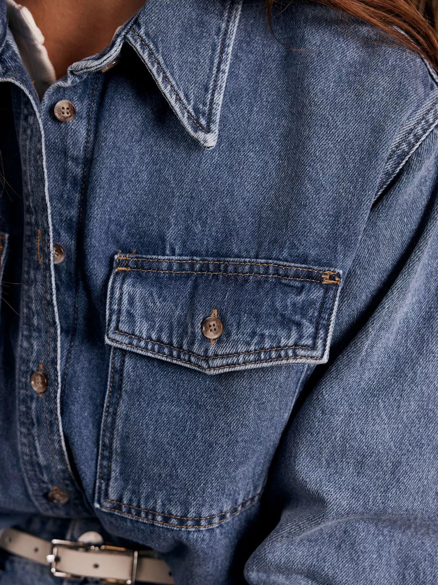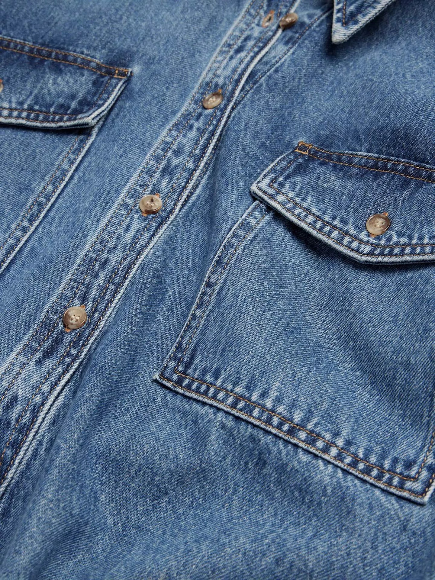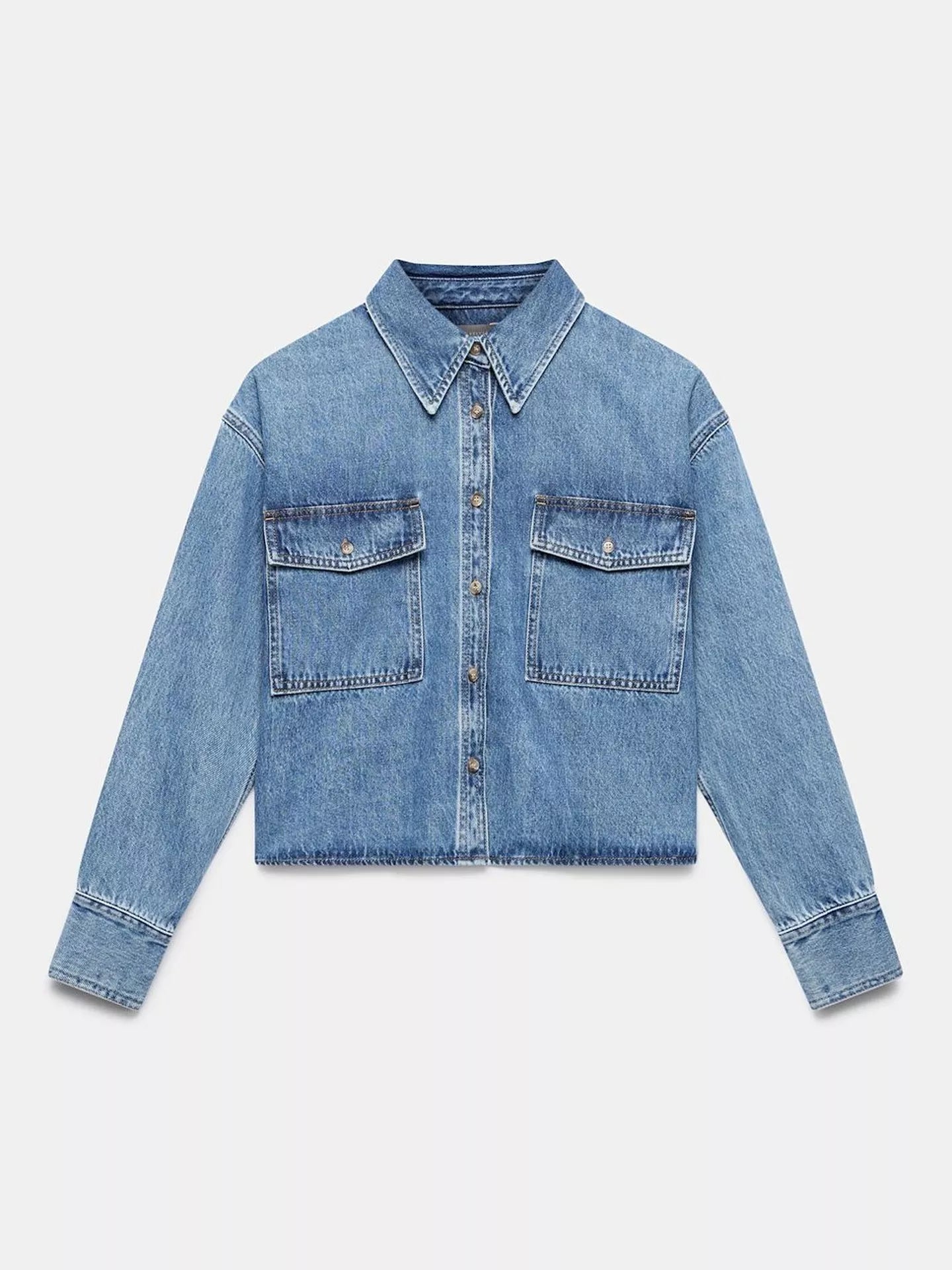 Classic denim details include a neat collar neckline, functional button down flap pockets, and buttoned cuffs on the long sleeves. Complete with a button fastening through the front, this shirt offers endless styling opportunities and is a chic, neat addition to your everyday staples.